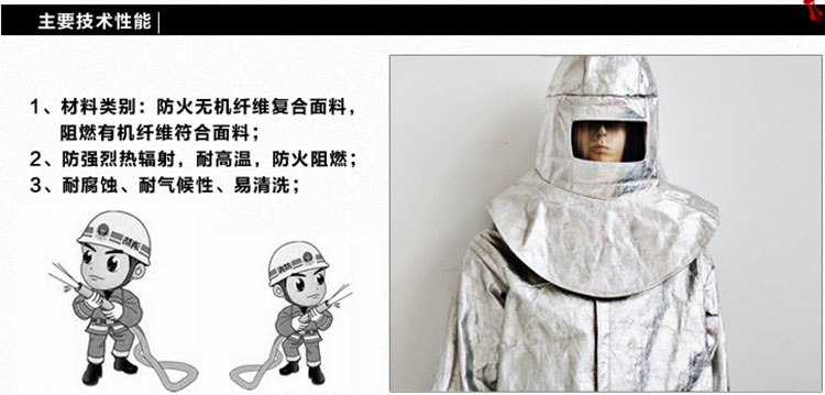 在高温场所工作时的防护服,以防强烈的热辐射,如:钢铁行业、冶炼行业、铸造行业、石油行业、燃气行业、其他高温行业消防防护服等,用来个人防护、扑救火灾。