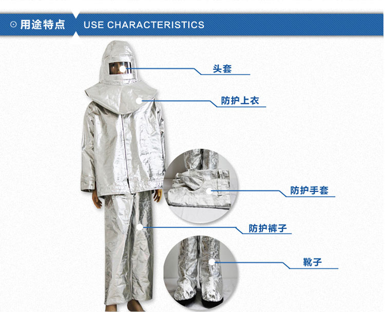 在高温场所工作时的防护服,以防强烈的热辐射,如:钢铁行业、冶炼行业、铸造行业、石油行业、燃气行业、其他高温行业消防防护服等,用来个人防护、扑救火灾。